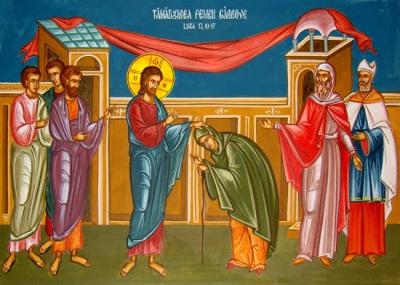 Η διήγηση της σημερινής Ευαγγελικής περικοπής μας περιγράφει τη θεραπεία της συγκύπτουσας, μιας γυναίκας που λόγω της ασθένειάς της ήταν κυρτωμένη και ταλαιπωρούνταν επί δεκαοκτώ έτη. Όταν την είδε ο Χριστός, ένα Σάββατο που δίδασκε στη Συναγωγή, την σπλαγχνίστηκε, μας λέει ο ευαγγελιστής Λουκάς, και με ένα Του λόγο, χωρίς αυτή να το ζητήσει, τη θεράπευσε. Ωστόσο το θαύμα αυτό αντί να κάνει τους σκληρόκαρδους φαρισαίους να θαυμάσουν μαζί με όλο το λαό τα μεγαλεία του Θεού, κίνησε την αγανάκτηση του αρχισυνάγωγου, που τους κάλεσε να προσέρχονται τις άλλες μέρες για να θεραπεύονται, και να μη "καταλύουν" την αργία του Σαββάτου. "Υποκριτές", απαντά ο Ιησούς, "ο καθένας δεν λύνει το Σάββατο το βόδι του ή το γαϊδουράκι του για να πάει να το ποτίσει; και αυτή η γυναίκα, που δεν είναι ζωντανό αλλά παιδί του Αβραάμ, δεν έπρεπε λοιπόν να λυθεί από τα δεσμά που επί δεκαοχτώ χρόνια την είχε δέσει ο διάβολος, επειδή σήμερα είναι Σάββατο;" Μέσα από τη σημερινή διήγηση ο Κύριος στηλιτεύει την υποκρισία και την τυπολατρία όχι μόνον των φαρισαίων, αλλά και κάθε ανθρώπου, κάθε εποχής. Οι φαρισαίοι της εποχής Του είχαν μετατρέψει τις εντολές του Δεκαλόγου και του Νόμου σε ένα στείρο σύστημα υποχρεώσεων και περιορισμών, και γι αυτό συχνά αντιδρούσαν με αγανάκτηση όταν ο Χριστός θεράπευε τα Σάββατα, σε σημείο να λένε ότι εφόσον δεν τηρεί το Σάββατο, δεν προέρχεται από τον Θεό1. Η τυπολατρία τούς έκανε να θεωρούν τους εαυτούς τους αυτάρκεις έναντι του Θεού, σαν τον πλούσιο της περασμένης Κυριακής, που θεωρούσε τον εαυτό του τέλειο, μιας που δεν είχε κλέψει και δεν είχε σκοτώσει. Αγανακτούν οι φαρισαίοι που ο Χριστός κάνει θαύματα το Σάββατο, αγανακτούν που συνομιλεί και τρώει μαζί με αμαρτωλούς, αγανακτούν όταν βλέπουν τους μαθητές Του να τρώνε χωρίς προηγουμένως να έχουν πλύνει τα χέρια τους, ή να μην τηρούν επακριβώς τις νηστείες2. Ο Χριστός όμως την περασμένη Κυριακή δίδαξε την ανάγκη της εξόδου από την εγωκεντρική αυτάρκεια και σήμερα μάς δείχνει ότι πάνω από τους τύπους βρίσκεται η ουσία των πραγμάτων και η αλήθεια. Γι αυτό και θα πει χαρακτηριστικἀ ότι δεν είναι φτιαγμένος ο άνθρωπος για το Σάββατο, αλλά το Σάββατο για τον άνθρωπο3, ότι δηλαδή μεγαλύτερη σημασία έχει ο άνθρωπος ως ψυχοσωματική οντότητα, παρά η επακριβής τήρηση κάποιων κανόνων, ιδίως όταν παραβλέπεται το ανθρώπινο πρόσωπο. Το μήνυμα όμως του Ευαγγελίου, το κήρυγμα του Χριστού αλλά και ο τρόπος της ενανθρώπησής Του και του Πάθους Του δίνουν προτεραιότητα στην ελευθερία του ανθρώπινου προσώπου και στοχεύουν στην πνευματική του αποδέσμευση τόσο από τα δεσμά της αμαρτίας όσο και από τις στείρες υποχρεώσεις που φορτίζουν και καταπιέζουν τον άνθρωπο. Η τυπική και μηχανιστική τήρηση των εντολών του Θεού τελικά δεν μας προσφέρει τίποτα, αν στην καρδιά μας δεν πρυτανεύει η αγάπη προς τον πλησίον, η ευσπλαχνία και η διάθεση της προσφοράς και της αυτοθυσίας. Το μήνυμα επομένως της σημερινής περικοπής μας αγγίζει και μας αφορά όλους, μιας που συχνά, ίσως και ασυναίσθητα, προτάσσουμε τις εντολές του Θεού και βάζουμε σε δεύτερη μοίρα την αγάπη προς τον πλησίον. Άλλες φορές πάλι, είτε θεωρούμε τους εαυτούς μας εντάξει έναντι του θεού, και άρα ο Θεός μάς οφείλει, είτε αγανακτούμε όταν κάποιοι από τους αδελφούς μας δεν τηρούν όλα όσα εμείς τηρούμε, και προσπαθούμε να τους πειθαναγκάσουμε να ακολουθήσουν τ